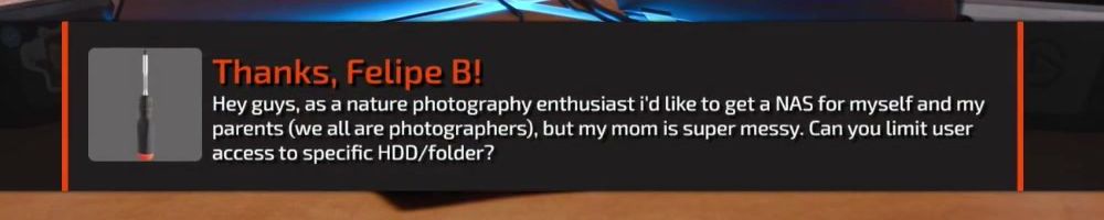 Thanks, Felipe B! Hey guys, as a nature photography enthusiast i'd like to get a NAS for myself and my parents (we all are photographers), but my mom is super messy. Can you limit user access to specific HDD/folder?