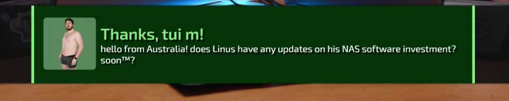 Thanks, tui m! hello from Australia! does Linus have any updates on his NAS software investment? soon™?