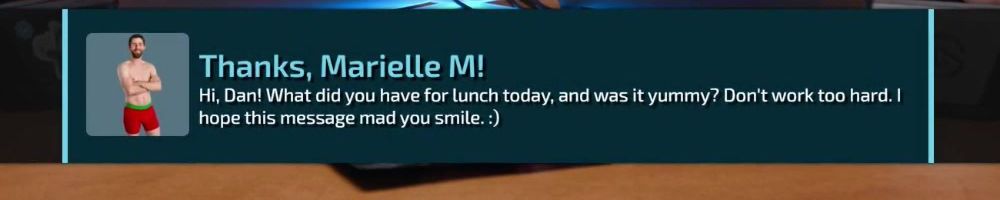 Thanks, Marielle M! Hi, Dan! What did you have for lunch today, and was it yummy? Don't work too hard. I hope this message mad you smile. :)