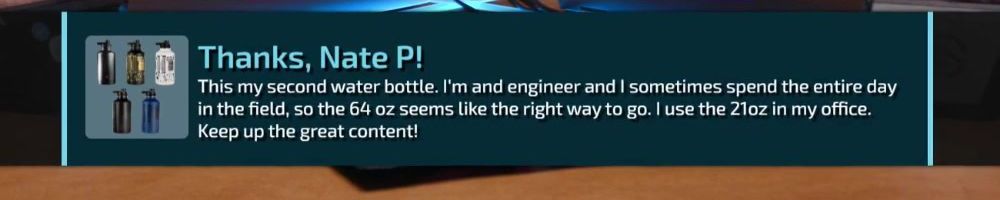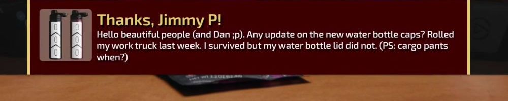 Thanks, Jimmy P! Hello beautiful people (and Dan ;p). Any update on the new water bottle caps? Rolled my work truck last week. I survived but my water bottle lid did not. (PS: cargo pants when?)
