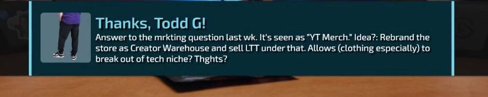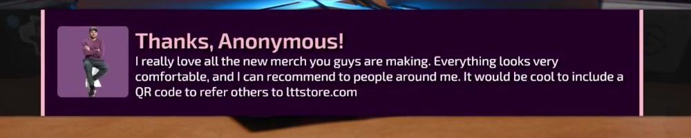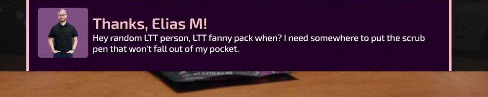 Thanks, Elias M! Hey random LTT person, LTT fanny pack when? I need somewhere to put the scrub pen that won't fall out of my pocket.