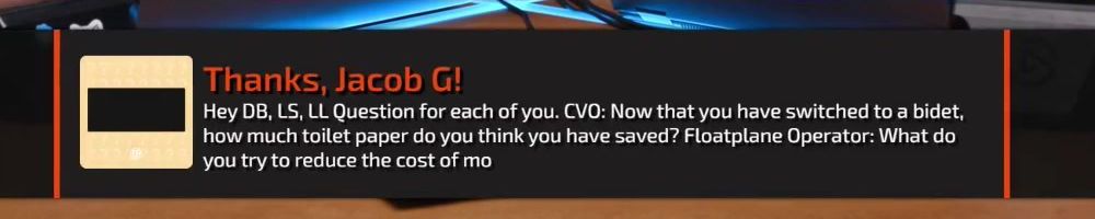 Thanks, Jacob G! Hey DB, LS, LL Question for each of you. CVO: Now that you have switched to a bidet, how much toilet paper do you think you have saved? Floatplane Operator: What do you try to reduce the cost of mo