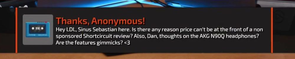 Thanks, Anonymous! Hey LDL, Sinus Sebastian here. Is there any reason price can't be at the front of a non sponsored Shortcircuit review? Also, Dan, thoughts on the AKG N90Q headphones? Are the features gimmicks? <3