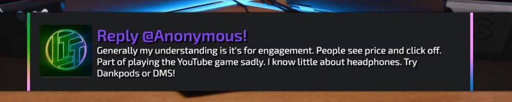 Reply @Anonymous! Generally my understanding is it's for engagement. People see price and click off. Part of playing the YouTube game sadly. I know little about headphones. Try Dankpods or DMS!