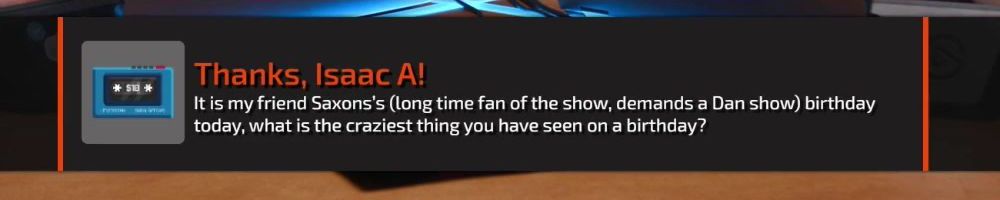 Thanks, Isaac A! It is my friend Saxons's (long time fan of the show, demands a Dan show) birthday today, what is the craziest thing you have seen on a birthday?