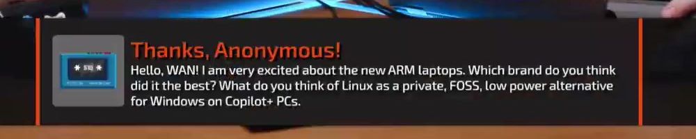Thanks, Anonymous! Hello, WAN! I am very excited about the new ARM laptops. Which brand do you think did it the best? What do you think of Linux as a private, FOSS, low power alternative for Windows on Copilot+ PCs.