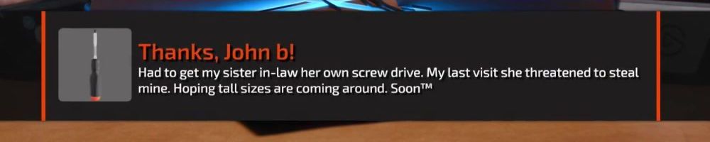 Thanks, John b! Had to get my sister in-law her own screw drive. My last visit she threatened to steal mine. Hoping tall sizes are coming around. Soon™