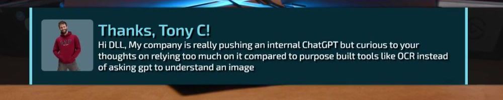 Thanks, Tony C! Hi DLL, My company is really pushing an internal ChatGPT but curious to your thoughts on relying too much on it compared to purpose built tools like OCR instead of asking gpt to understand an image