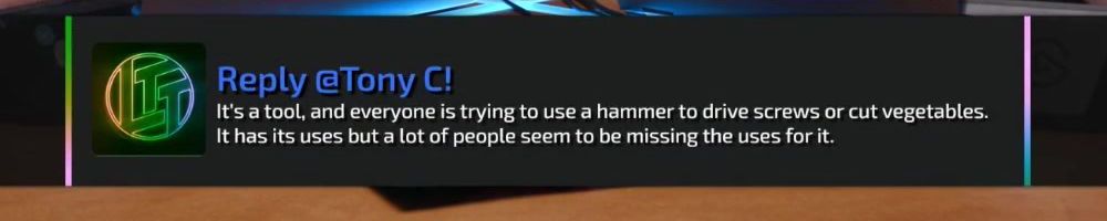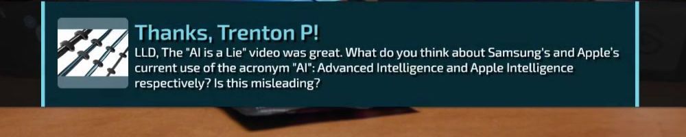 Thanks, Trenton P! LLD, The "AI is a Lie" video was great. What do you think about Samsung's and Apple's current use of the acronym "AI": Advanced Intelligence and Apple Intelligence respectively? Is this misleading?