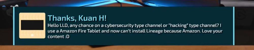 Thanks, Kuan H! Hello LLD, any chance on a cybersecurity type channel or "hacking" type channel? I use a Amazon Fire Tablet and now can't install Lineage because Amazon. Love your content :D