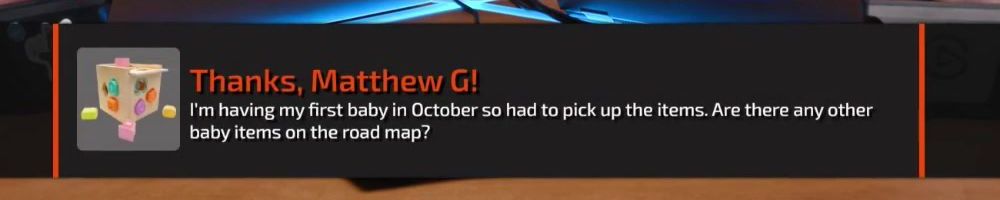 Thanks, Matthew G! I'm having my first baby in October so had to pick up the items. Are there any other baby items on the road map?