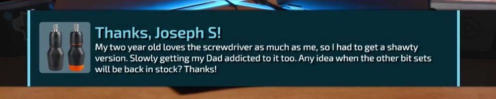 Thanks, Joseph S! My two year old loves the screwdriver as much as me, so I had to get a shawty version. Slowly getting my Dad addicted to it too. Any idea when the other bit sets will be back in stock? Thanks!