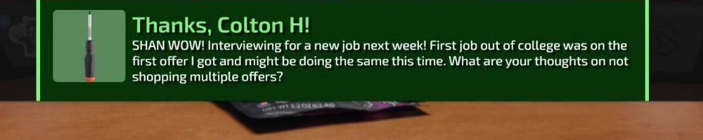 Thanks, Colton H! SHAN WOW! Interviewing for a new job next week! First job out of college was on the first offer I got and might be doing the same this time. What are your thoughts on not shopping multiple offers?
