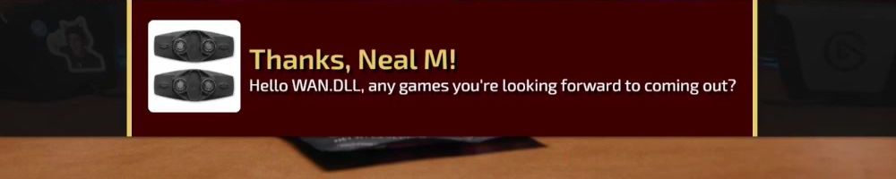 Thanks, Neal M! Hello WAN.DLL, any games you're looking forward to coming out?