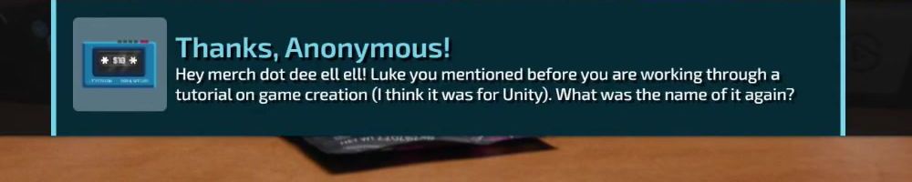 Thanks, Anonymous! Hey merch dot dee ell ell! Luke you mentioned before you are working through a tutorial on game creation (I think it was for Unity). What was the name of it again?