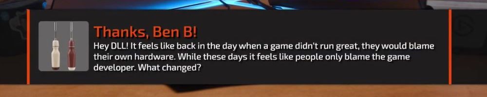 Thanks, Ben B! Hey DLL! It feels like back in the day when a game didn't run great, they would blame their own hardware. While these days it feels like people only blame the game developer. What changed?