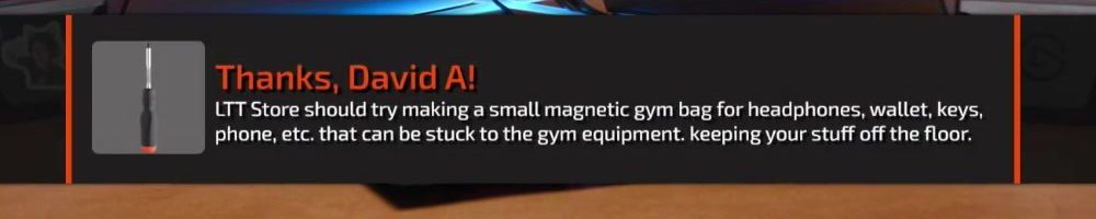 Thanks, David A! LTT Store should try making a small magnetic gym bag for headphones, wallet, keys, phone, etc. that can be stuck to the gym equipment. keeping your stuff off the floor.