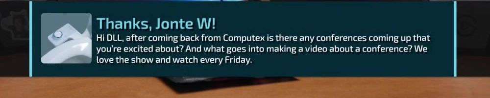 Thanks, Jonte W! Hi DLL, after coming back from Computex is there any conferences coming up that you're excited about? And what goes into making a video about a conference? We love the show and watch every Friday.