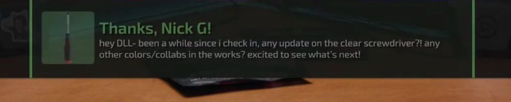 Thanks, Nick G! hey DLL- been a while since i check in, any update on the clear screwdriver?! any other colors/collabs in the works? excited to see what's next!