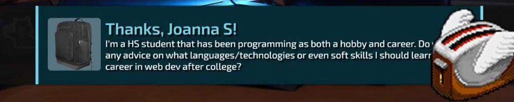 Thanks, Joanna S! I'm a HS student that has been programming as both a hobby and career. Do you have any advice on what languages/technologies or even soft skills I should learn to pursue a career in web dev after college?