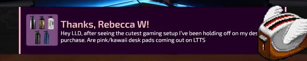 Thanks, Rebecca W! Hey LLD, after seeing the cutest gaming setup I've been holding off on my des purchase. Are pink/kawaii desk pads coming out on LTTS