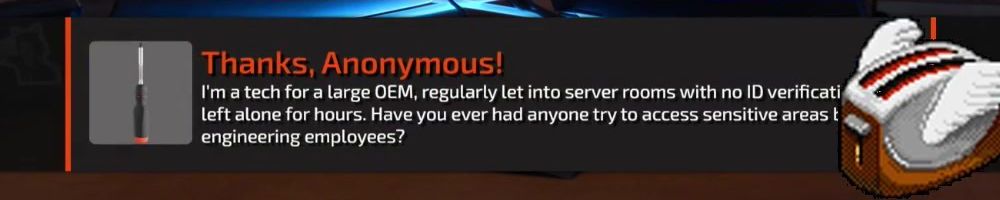 Thanks, Anonymous! I'm a tech for a large OEM, regularly let into server rooms with no ID verificati left alone for hours. Have you ever had anyone try to access sensitive areas t engineering employees?