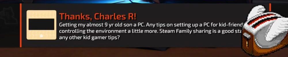 Thanks, Charles R! Getting my almost 9 yr old son a PC. Any tips on setting up a PC for kid-friendly controlling the environment a little more. Steam Family sharing is a good start any other kid gamer tips?