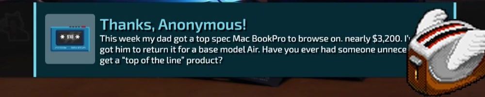 Thanks, Anonymous! This week my dad got a top spec Mac BookPro to browse on. nearly $3,200. I' got him to return it for a base model Air. Have you ever had someone unnece get a “top of the line" product?