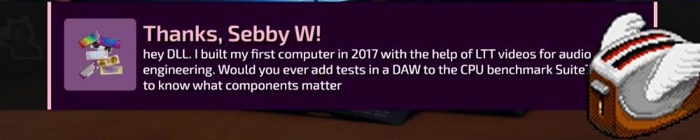 Thanks, Sebby W! hey DLL. I built my first computer in 2017 with the help of LTT videos for audio engineering. Would you ever add tests in a DAW to the CPU benchmark Suite' to know what components matter