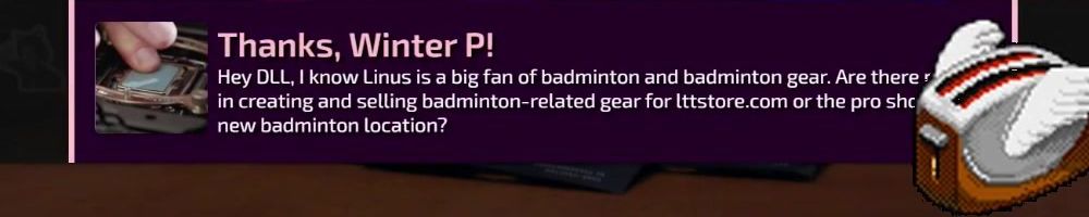 Thanks, Winter P! Hey DLL, I know Linus is a big fan of badminton and badminton gear. Are there in creating and selling badminton-related gear for lttstore.com or the pro she new badminton location?