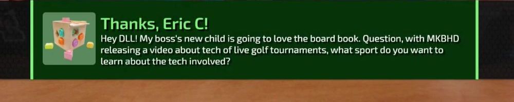 Thanks, Eric C! Hey DLL! My boss's new child is going to love the board book. Question, with MKBHD releasing a video about tech of live golf tournaments, what sport do you want to learn about the tech involved?