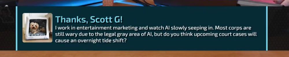 Thanks, Scott G! I work in entertainment marketing and watch Al slowly seeping in. Most corps are still wary due to the legal gray area of Al, but do you think upcoming court cases will cause an overnight tide shift?