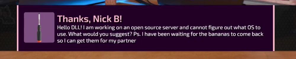 Thanks, Nick B! Hello DLL! I am working on an open source server and cannot figure out what OS to use. What would you suggest? Ps. I have been waiting for the bananas to come back so I can get them for my partner