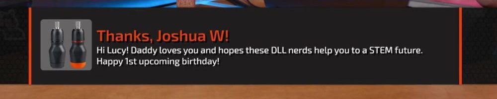 Thanks, Joshua W! Hi Lucy! Daddy loves you and hopes these DLL nerds help you to a STEM future. Happy 1st upcoming birthday!