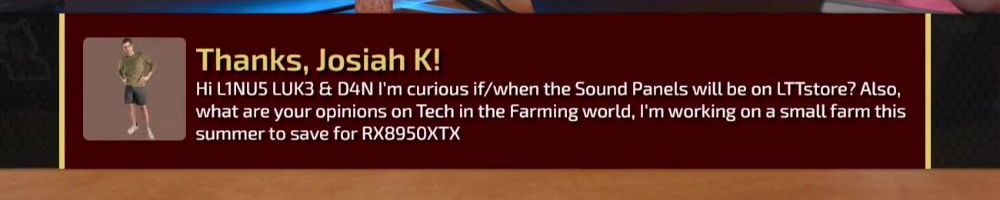 Thanks, Josiah K! Hi LINUS LUK3 & D4N I'm curious if/when the Sound Panels will be on LTTstore? Also, what are your opinions on Tech in the Farming world, I'm working on a small farm this summer to save for RXB950XTX