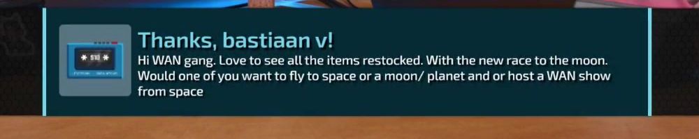 Thanks, bastiaan v! Hi WAN gang. Love to see all the items restocked. With the new race to the moon. Would one of you want to fly to space or a moon/ planet and or host a WAN show from space