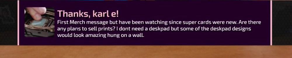 Thanks, karl e! First Merch message but have been watching since super cards were new. Are there any plans to sell prints? I don't need a deskpad but some of the deskpad designs would look amazing hung on a wall.