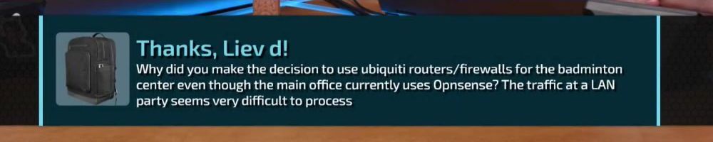 Thanks, Liev d! Why did you make the decision to use ubiquiti routers/firewalls for the badminton center even though the main office currently uses Opnsense? The traffic at a LAN party seems very difficult to process
