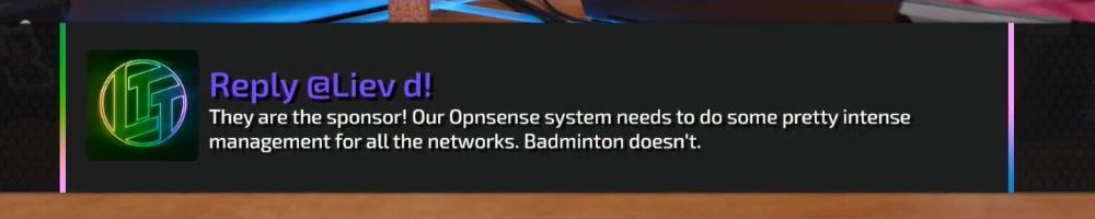 Reply @Liev d! They are the sponsor! Our Opnsense system needs to do some pretty intense management for all the networks. Badminton doesn't.
