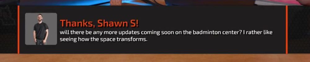 Thanks, Shawn S! will there be any more updates coming soon on the badminton center? I rather like seeing how the space transforms.