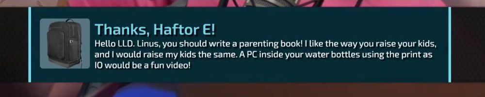 Thanks, Haftor E! Hello LLD. Linus, you should write a parenting book! I like the way you raise your kids, and I would raise my kids the same. A PC inside your water bottles using the print as 10 would be a fun video!