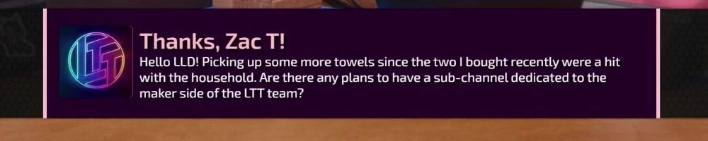 Thanks, Zac T! Hello LLD! Picking up some more towels since the two I bought recently were a hit with the household. Are there any plans to have a sub-channel dedicated to the maker side of the LTT team?