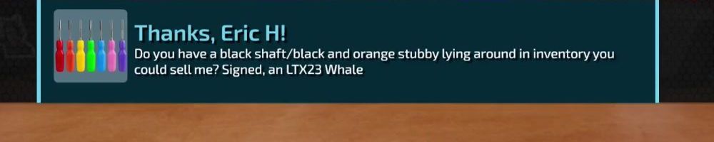 Thanks, Eric H! Do you have a black shaft/black and orange stubby lying around in inventory you could sell me? Signed, an LTX23 Whale
