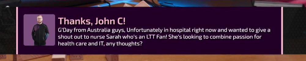Thanks, John C! G'Day from Australia guys, Unfortunately in hospital right now and wanted to give a shout out to nurse Sarah who's an LTT Fan! She's looking to combine passion for health care and IT, any thoughts?