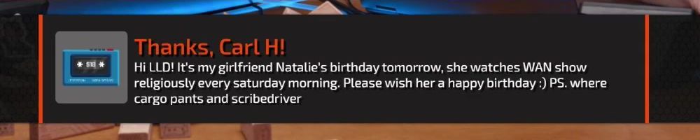 Thanks, Carl H! Hi LLD! It's my girlfriend Natalie's birthday tomorrow, she watches WAN show religiously every saturday morning. Please wish her a happy birthday :) PS. where cargo pants and scribedriver