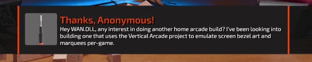 Thanks, Anonymous! Hey WAN.DLL, any interest in doing another home arcade build? I've been looking into building one that uses the Vertical Arcade project to emulate screen bezel art and marquees per-game.