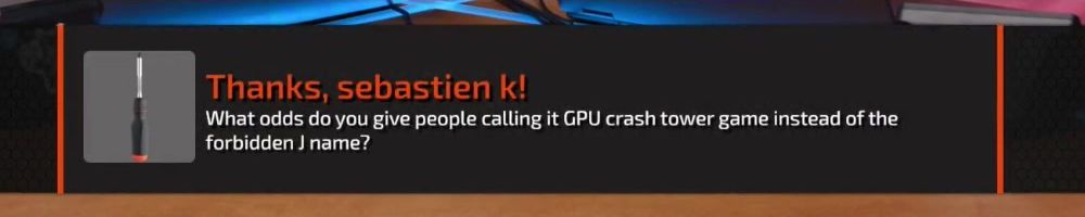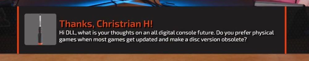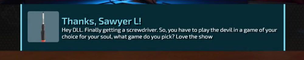 Thanks, Sawyer L! Hey DLL. Finally getting a screwdriver. So, you have to play the devil in a game of your choice for your soul, what game do you pick? Love the show