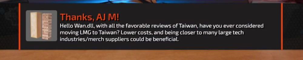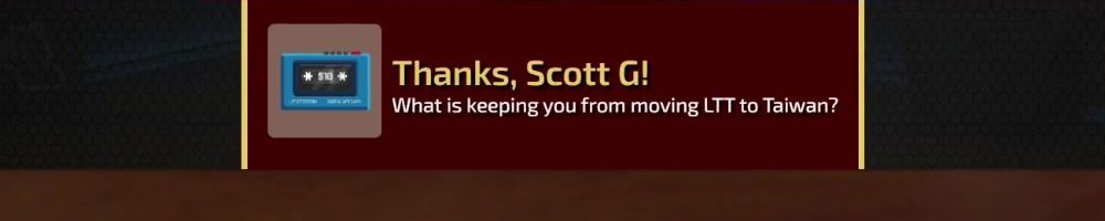 Thanks, Scott G! What is keeping you from moving LTT to Taiwan?