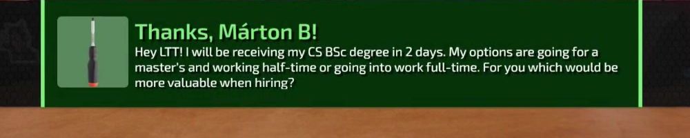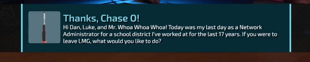 Thanks, Chase O! Hi Dan, Luke, and Mr. Whoa Whoa Whoa! Today was my last day as a Network Administrator for a school district I've worked at for the last 17 years. If you were to leave LMG, what would you like to do?