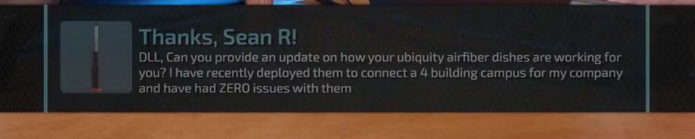 Thanks, Sean R! DLL, Can you provide an update on how your ubiquity airfiber dishes are working for you? I have recently deployed them to connect a 4 building campus for my company and have had ZERO issues with them